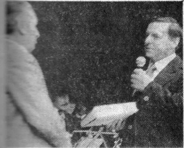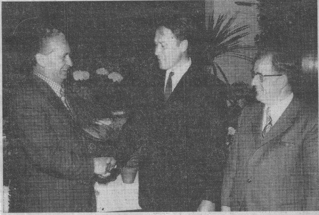 | 1977 | ![]() Josef Weikmann, Bürgermeister der Gemeinde Au, erwarb sich viele Verdienste um die Sonderfahrt „Ein Dorf geht auf Reisen", an der rund, 700 Auer Bürger - eine geradezu unvorstellbare Zahl teilnahmen. Sein Amtskollege von Tschagguns im Vorarlberger Montafon, Eduard Bitschnau überreichte dem Gast aus Au (links) als Erinnerung das „Montafoner Heimatbuch“. Bild/Text: hak |