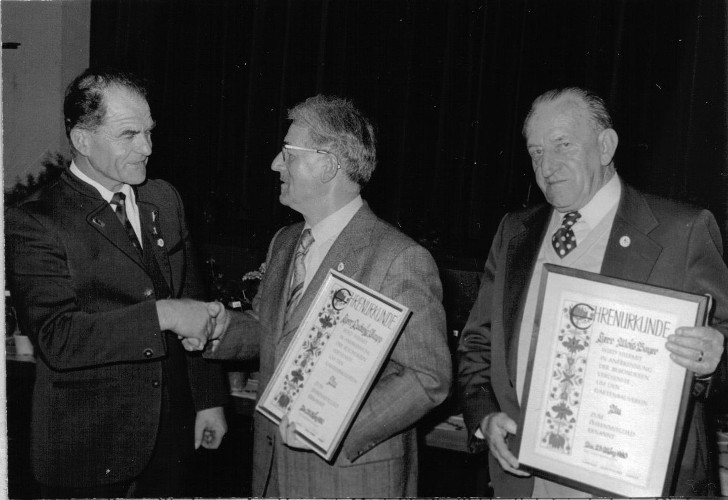 | 23. März 1980 | ![]() Beim OBST- UND GARTENBAUVEREIN AU - zeichnete der Bayerische Landesverband acht Mitglieder mit der Goldenen Verbandsehrenadel aus. so zweiten Vorsitzenden Franz Merkle, Dornweiler (seit 19 Jahren zweiter Vorsitzender und drei Jahre erster Vorsitzender) und Anton Ertle (2. von rechts), Magdalena Hieber (3. von rechts), Christine Ertle (3., von links) und Leonhard Haugg (2. von links). Für die Ausgezeichneten Eugen Oßwald sen. nahm Sohn Eugen (links) und für Johann Schütz Gattin Walli (4. von links) die hohe Auszeichnung aufgrund langjähriger Mitgliedschaft entgegen. Karl Eichenhofer, der 25 Jahre als Schriftführer diente, wurde gleichfalls ausgezeichnet. hak-Bild Mit dem Verein viele Gärten geplantBewährte Vorstandschaft bei Gartenfreunden weiter im Amt Illertissen -Au (hak). Beim Obst- und Gartenbauverein Au ist alles im Lot. Das zeigte die Generalversammlung in der „Josef-Weikamm-Halle“ auf, die mit einemvollen Saal Rekordbesuch zeigte. Bei den fälligen Neuwahlen blieb die bewährte Vorstandschaft mit Vorsitzendem Ludwig Rapp, der seit 20 Jahren dem mitgliederstarken vorsteht, im Amt. In seinem Jahresbericht sagte Rapp, daß unter das Dosengeschäft ein Schlußstrich gezogen werden mußte, da keine Nachfrage mehr dafür bestehe. Die Dosenmaschine stehe jedoch auch weiterhin den Mitgliedern zur Verfügung. Die Frühjahrsspritzung im Vorjahr habe aufgrund der schlechten Witterungsverhältnisse manche Sorgen bereitet. Sein Dank galt besonders Spritzwart Franz Bailer. Bestellungen für Nistkästen sollen umgehend aufgegeben werden. Gartenbauchef Rapp stellte mit Stolz fest, daß über den Verein 65 Vogelnistkästen bezogen wurden und zehn davon in gemeindlichen Anlagen darunter auch im Friedhof und Kinderspielplatz angebracht werden konnten. Präsente gab es für Spritzwart Franz Bailer, Dosenwart Alois Scherer und Vereinsdienerin Elisabeth Holl. Schriftführer Franz Ritschel unterstrich, daß eine neue Obstbaumspritze beschafft wurde, die große finanzielle Anstrengungen erforderte. In Zusammenarbeit mit dem Verein planten Hausbesitzer 210 Hausgärten. Kassier Alois Bayer, der seit 22 Jahren dieses Amt ausübt, meldete einen geringen Kassenbestand. Die Kassenprüfer Bruno Bauer und Max Weinzierl bestätigten eine einwandfreie Führung. Flott gingen die Neuwahlen über die Bühne. Sie zeigten folgendes Ergebnis: Erster Vorsitzender Ludwig Rapp, zweiter Vorsitzender Franz Merkle, Dornweiler, Kassier Alois Bayer Schriftführer Franz Ritschel, Kassenprüfer Bruno Bauer und Max Weinzierl, Spritzwart Franz Bailer, Vereinsdienerin Elisabeth Holl. In den Ausschuß wurden Centa Baur, Liesl Wanner, Hand Dannemann, Josef Gehring, Karl Bieber, Karl Eichenhofer, Franz Bailer und Walter Hoffmann berufen. Gut aufgenommen wurde der Farbdiavortrag von Gartenmeister Dann vom Landratsamt Neu-Ulm, vom Blumenschmuckwettbewerb des Landkreises im Vorjahr, sowie der Vortrag von Liesl und Rupert Wanner über Garten- und Blumenschmuck im Stadtteil Au. Jedes Los gewann anschließend bei der Blumenverlosung einen frischen Frühlingsgruß mit nach Hause nehmen konnte. ![]() DIE SILBERNE VERBANDSEHRENNADEL des Landesverbandes für Obst- und Gartenbau erhielten anlässlich der Generalversammlung beim Obst- und Gartenbauverein Au aufgrund langjähriger Vereinszugehörigkeit die Mitglieder (im Bild von rechts nach links) Josef Gehring, Martin Wanner, Andreas Handfest, Anton Binder (für ihn nahm Gattin Maria Binder die Nadel in Empfang) und Anna Baur (Schwester Resi Baur auf dem Bild Empfang nehmende der Nadel) Bild: hak |