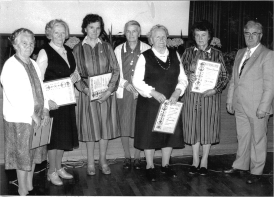| 15. April 1984 | ![]() Sechs neue Ehrenmitglieder hat der Obst- und Gartenbauverein Au. Bei der Jahresversammlung in der Josef-Weikmann-Halle wurden Maria Jank, Ida Schwab, Maria Schlüter, Barbara Walter, Sophie Enderle und Franziska Weikmann (von links nach rechts) zu neuen Ehrenmitgliedern ernannt. Vorsitzender Ludwig Rapp (rechts) überreichte die Ehrenurkunden. |