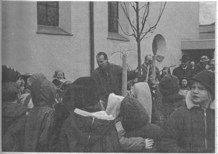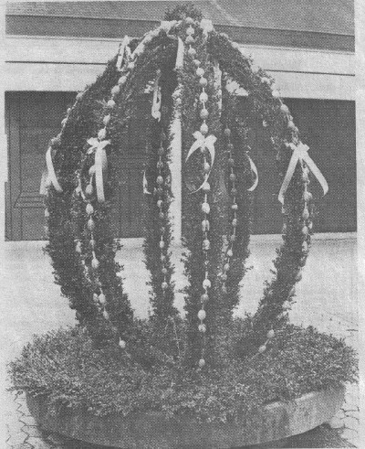 | 1990 | Noch erfreut der Osterbrunnen![]() Belebt ist erstmals der Innenhof des Pfarrzentrums in Au mit einem Osterbrunnen, wozu die Gestaltung der Auer Obst. und Gartenbauverein mit Mitgliedern und Helfern übernahm. Vom Obst- und Gartenbauverein kam auch die Anregung des uralten Brauches, der besonders in Franken gepflegt wird. Franz Berchtold fertigte das zwei Meter hohe Stahlgerüst, das verzinkt und lackiert wurde. 320 Plastikeier in den buntesten Lackfarben malten die Kinder der Firmgruppe Gertrud Kreiser mit verschiedensten Motiven an, während die Gruppenangehörigen unter Leitung von Martina Mulzer die Holdergtecken mit kleinen Helfern fertigten. Aktive des Obst- und Gartenbauvereins sorgten schließlich auch für den grünen Buchs zwischen und unter den bunten Eierketten. Das bunte Bild, das viel Anerkennung fand, vervollständigten Bänder in den Farben rot, gelb und weiß. Schließlich sprudelte Wasser aus dem Innenhofbrunnen, denn frisches Wasser ist das Sinnbild des Lebens und der Taufe. Noch bis zum Fest der Erstkommunion soll der erste Osterbrunnen den Innenhof des Pfarrzentrums in Au zieren. Bild: Kuhn |