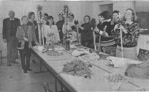 | 3. März 1997 | ![]() Ostern naht! In Au begeisterte Anni Berchtold (fünfte von links) Frauen bei einem Kurs des Obst- und Gartenbauvereins, wobei Osterpalmen gefertigt wurden. Sie werden als Hausschmuck immer beliebter. Bild: Kuhn Blumensträuße aus dem ParadiesObst- und Gartenbauverein Au mit österlichem Kurs Illertissen-Au (hak). Anni Berchtold, selbst Aktive in Vorstandschaft und Ausschuß des Obst- und Gartenbauvereins Au, verstand es, im Jubiläumsjahr ein Dutzend Frauen gerade jetzt in der österlichen Zeit zu begeistern. Sie veranstaltete im Werkraum der Josef-Weikmann-Halle einen Kurs, der sich „Osterpalmen und Osterschmuck" betitelte. In unserer rationalen technisierten Zeit wirken Osterpalmen, die zu Erinnerung an den Einzug Christi in Jerusalem in der vorösterlichen Zeit gebunden werden, wie wundersame Blumensträuße aus einem Paradies", las Berchtold den Kursteilnehmern am Anfang aus einem Werkbuch vor. Osterpalmen haben seit dem siebenten Jahrhundert Tradition. jedoch entwickelten sich ganz unterschiedliche Formen über die Jahre hinweg, so wie es auch bei diesem Kurs war. Anni Berchtold berichtete dem IZ-Reporter, daß der Palmen aus dem Raum Schwenningen am Neckar an einen Maibaum erinnern könnte. Das Ausblasen der Eier gehört längst der Vergangenheit an. Die Verbindung von Grün, bunten Bändern, Weidenkätzchen, Eiern und Früchten ist jedoch überall zu spüren. Das Ei erinnert im Heidnischen an die Fruchtbarkeit. Berchtold weckte Brauchtum und Tradition — und alle waren begeistert. Die Osterpalmen haben in der heutigen Zeit viele Liebhaber gefunden, die in ihm einen schönen Raumschmuck sehen. Da arbeiteten die Frauen mit Rundhölzern aus weichem Draht, durchbohrten Holzkugeln, richteten Eisendraht und Bindedraht, Holzkugeln, Kunststoffeier und Wachsfarben. Schon die Bemalung der Eier mit Wachsfarben verrät die schönsten Muster. Der Holzrundstab wird mit Buchs eingebunden, und auch bunte Schleifen aus Satinband fehlen nicht. Auch mit Symbolen der Passion können die Osterpalmen noch geschmückt werden. Doch auch schmucke Türkränze fertigte die Bastelgruppe in den fünf Kursabenden. Lob hatte der Erste Vorsitzende des Obst- und Gartenbauvereins Au, Franz Ritschel, bereit. Für ihn und die Mitglieder nahm das Jahr des 75jährigen Bestehens mit mehreren Veranstaltungen einen guten Anfang. |
