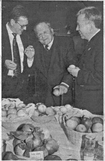 | Oktober 1997 | Apfel-KönigAls „Apfelkönig“ wurde der einstige Vorsitzende des Jubelvereins Au (1958 bi 1961) und Verdiente langjährig Baumwart Franz Merkle (Bildmitte) aus Dornweiler bezeichnet, der zur Gartenbauausstellung aus seinem Garten Früchte von 21 Apfelsorten gebracht hatte. Links im Bild ist Kreisvorsitzender Franz Josef Schick, rechts Bürgermeiser Karl-Heinz Brunner. Bild hak ![]() |